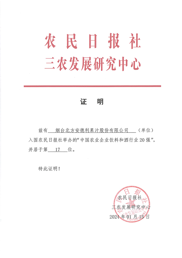 2024年1月,公司入圍“中國農(nóng)業(yè)企業(yè)飲料和酒行業(yè)20強”。